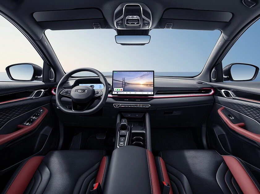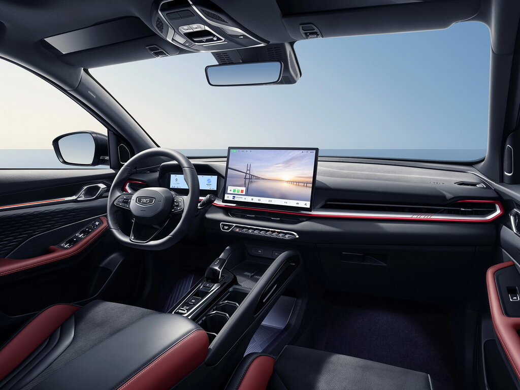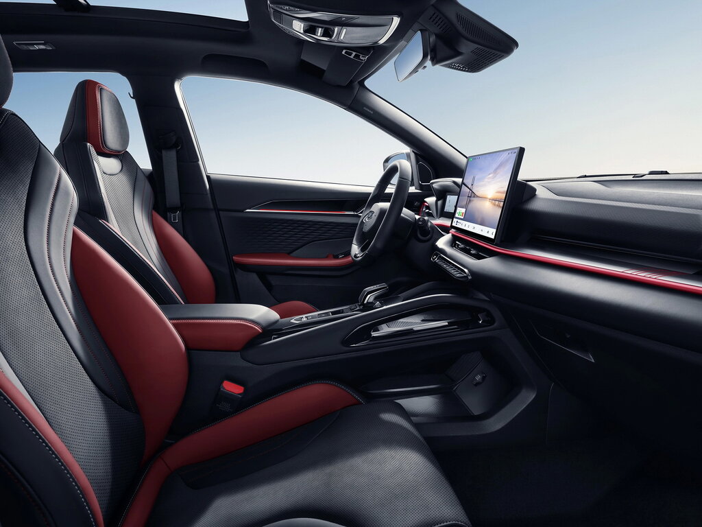 Отделка интерьера и сидений экокожей чёрного и красного цвета, солнцезащитные козырьки с прозрачной секцией из затемнённого стекла